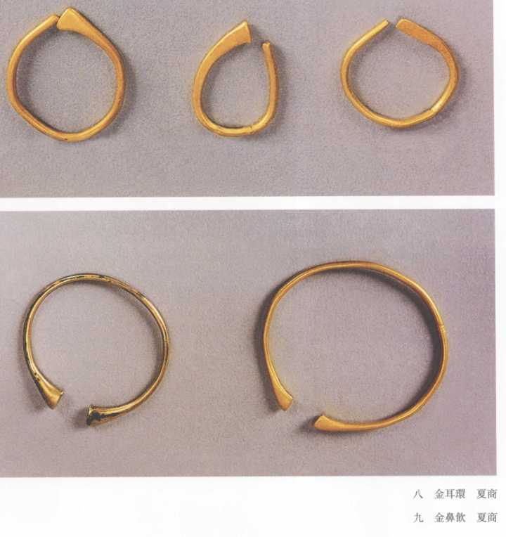 随着雅利安人的东进,金饰最先传到新疆、甘肃等地。中国目前发现最早的黄金制品金耳环,出现在甘肃玉门火烧沟遗址中,距今约4000年,相当于夏代。采用最原始的锤揲方法制作,纯度很高,微泛红色。具有安德罗诺沃文化风格。